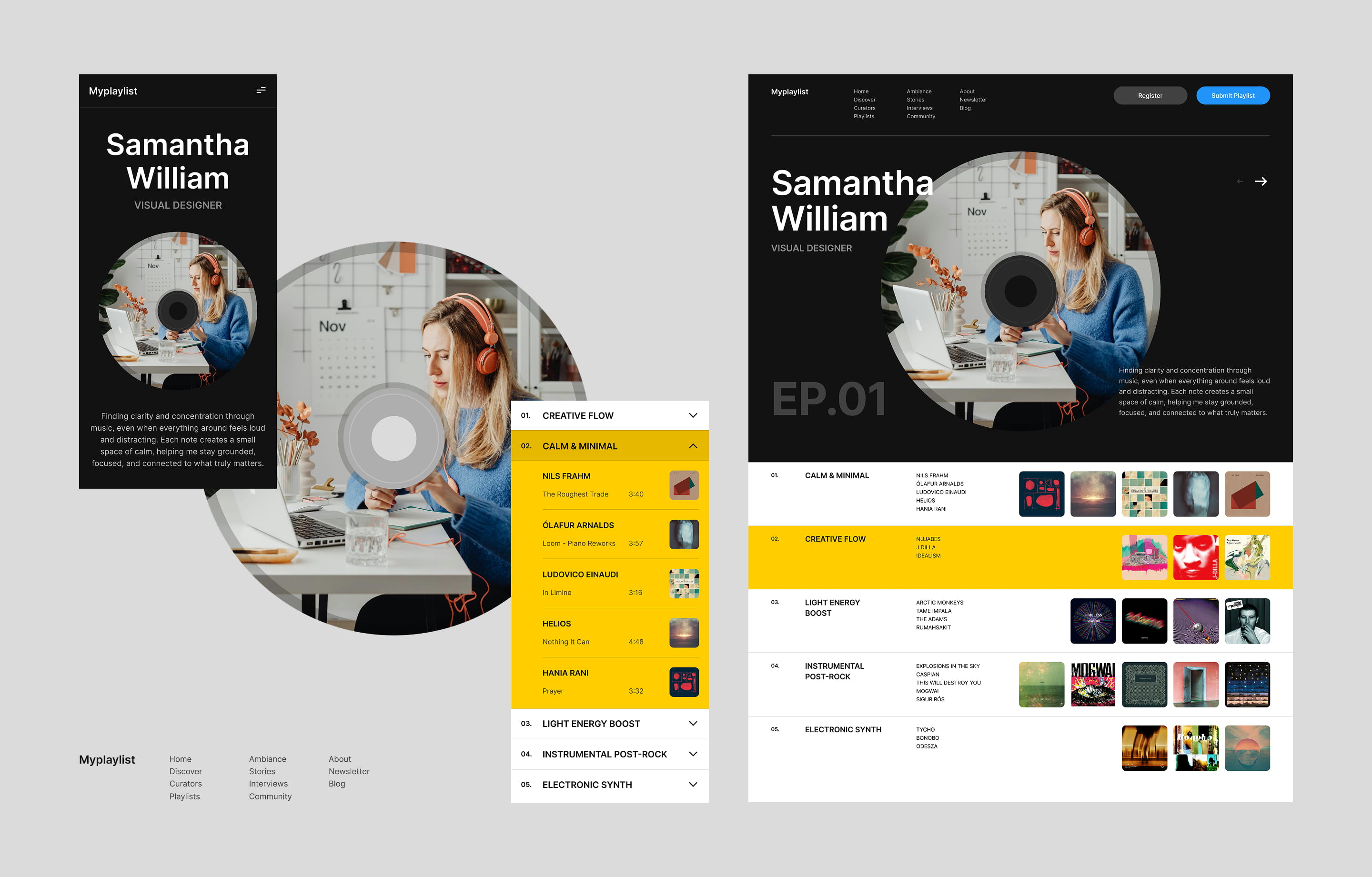 Exploring a clean and editorial website concept for a playlist platform curated by creative minds. The design highlights mood-based discovery, curator profiles, and immersive listening experiences.