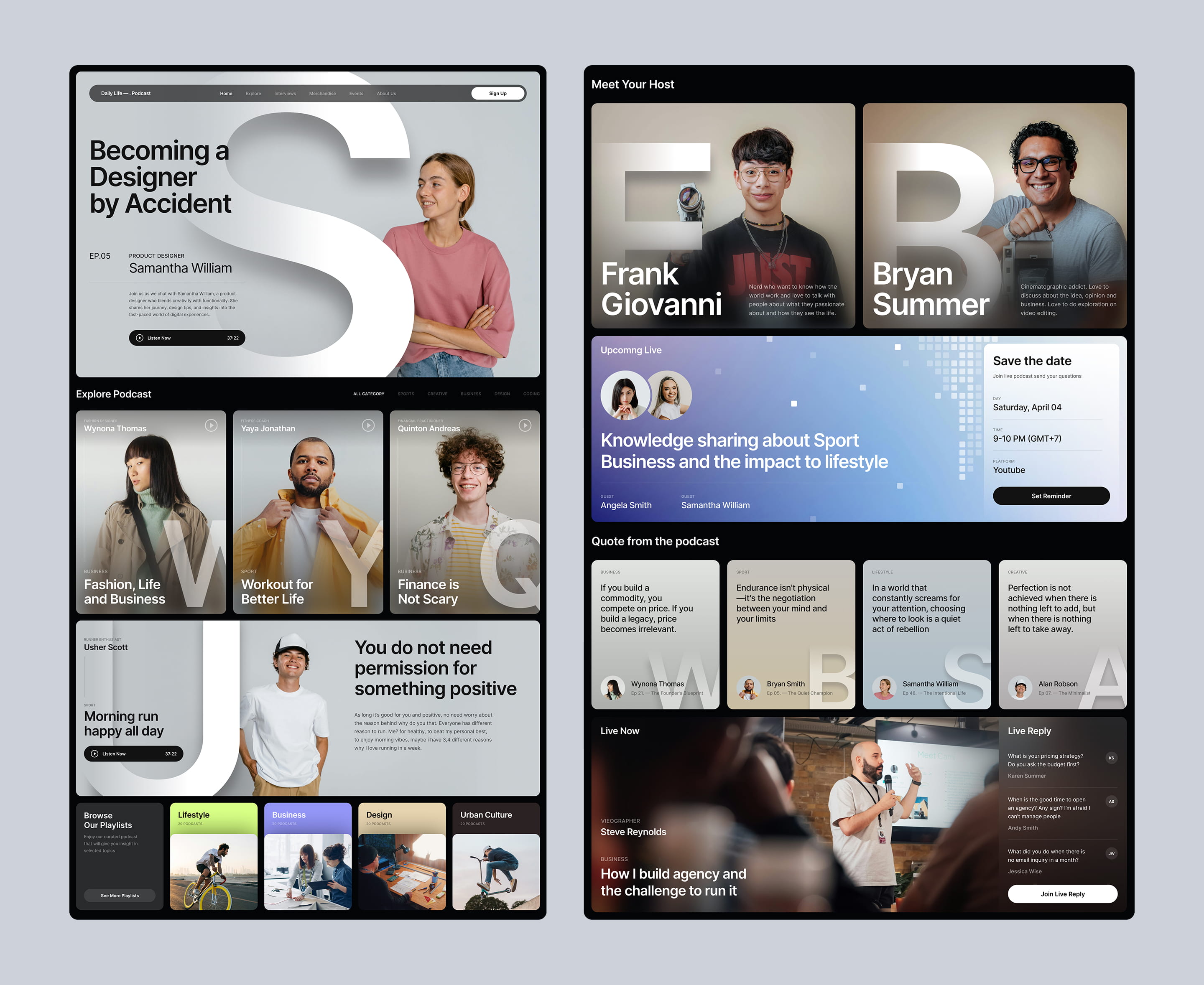 A reimagined podcasting experience stripped of visual clutter. This UI exploration prioritizes minimalism and striking visuals, letting the content breathe and focusing on the power of words.